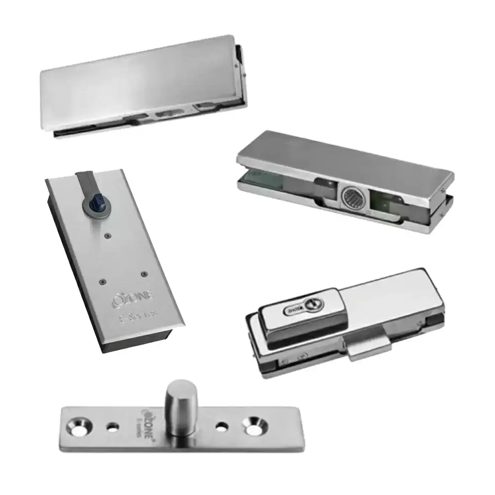 Central pivot hinge for balanced glass door movement.